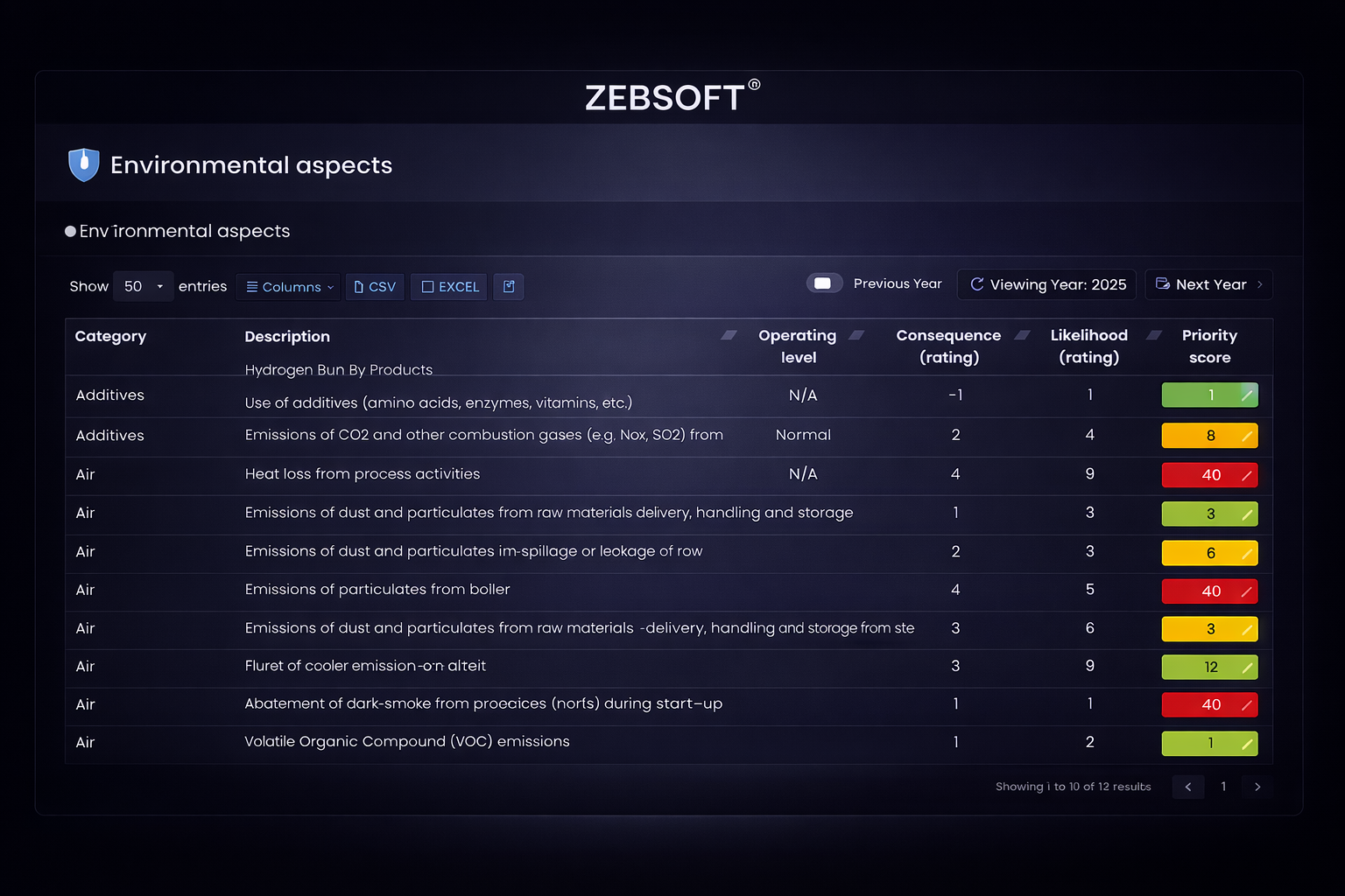 From aspects & impacts analysis to ESG data reporting, Zebsoft brings every environmental process into one connected system — removing the need for spreadsheets, disconnected tools, or guesswork.