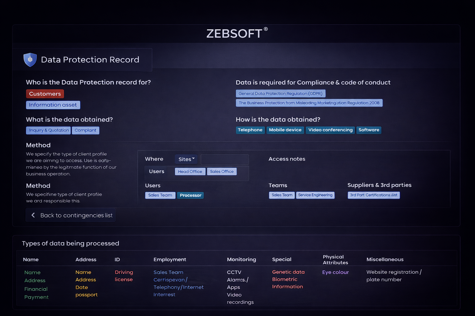 Every record is linked to lawful basis, consent type, and processor details, ensuring traceable, defensible compliance with UK GDPR, EU GDPR, and the Data Protection Act 2018. As an integrated compliance domain, Zebsoft GDPR Software connects every data protection function into a unified, defensible structure.